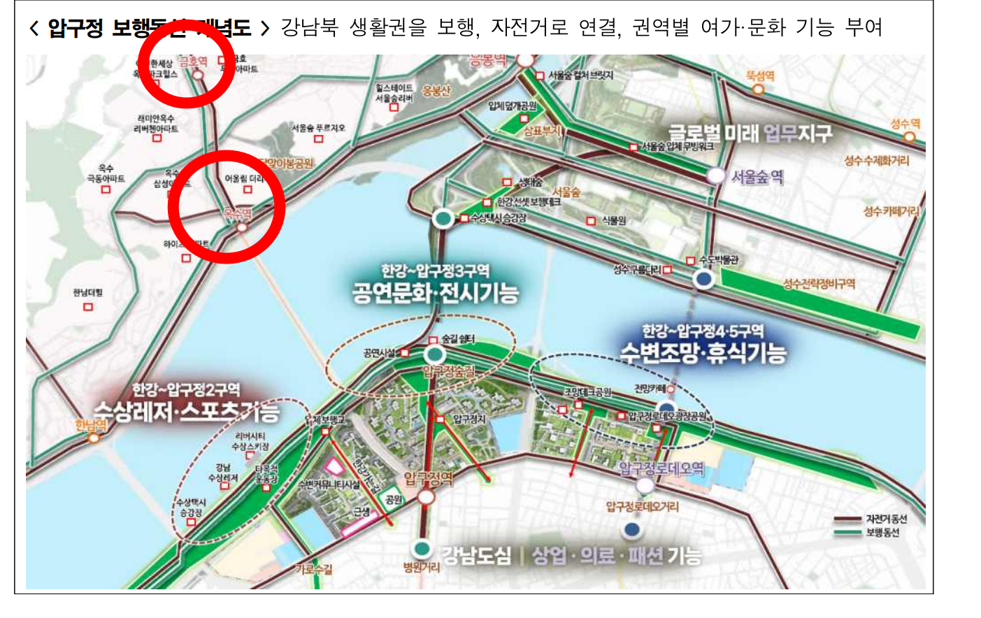 올림픽대로 위에 덮개공원이 조성되어 한강변 접근성이 향상되고 성수동까지 보행교가 설치될 예정이다.